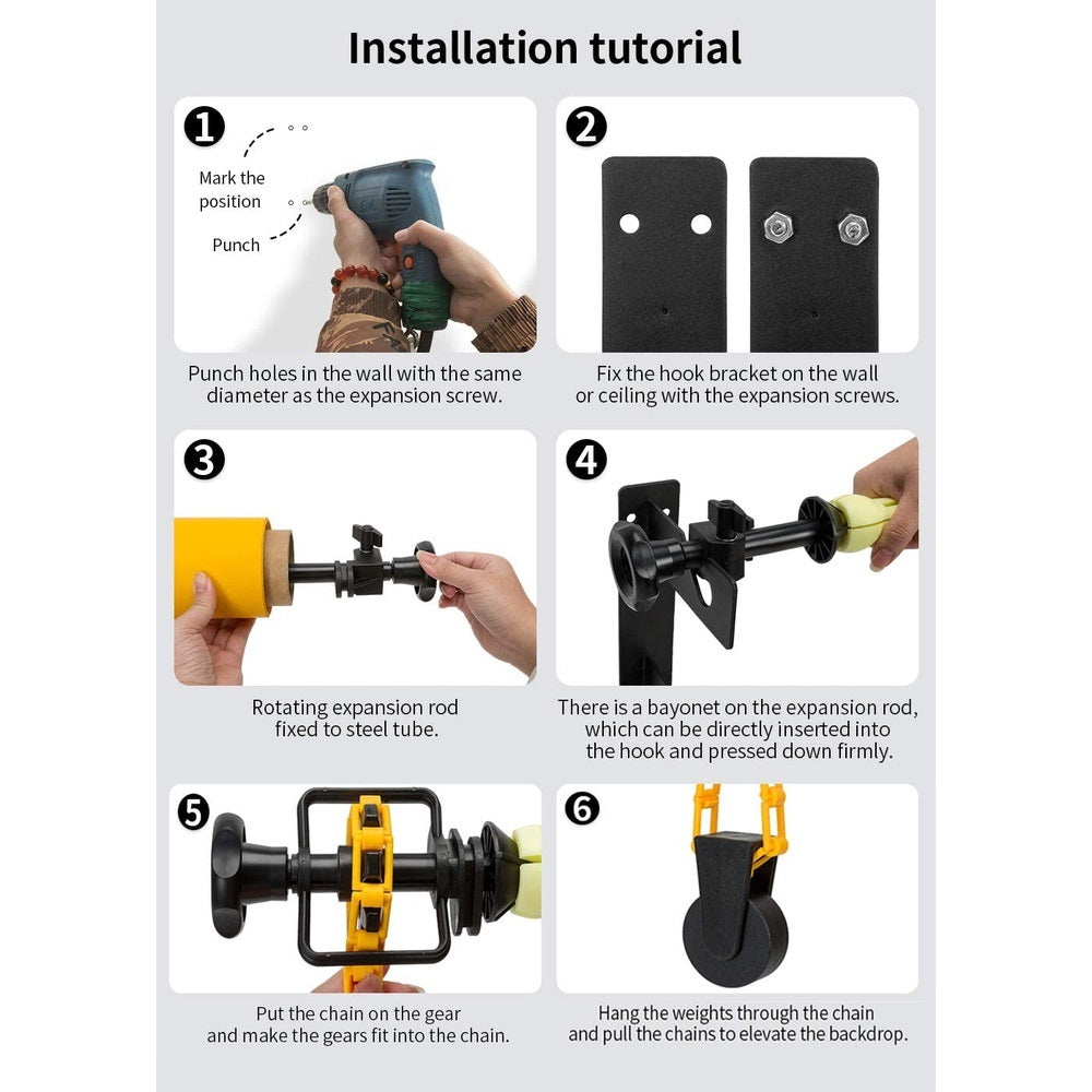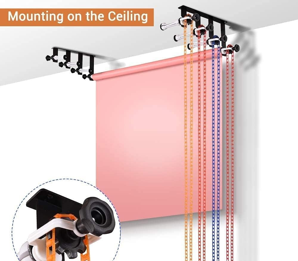 - Easy to Install: This 4 roller wall ceiling mount holder kit can be installed on the ceiling or wall. Takes up little space when the backdrop is rolled up. Note: The background paper and whistle are NOT included.