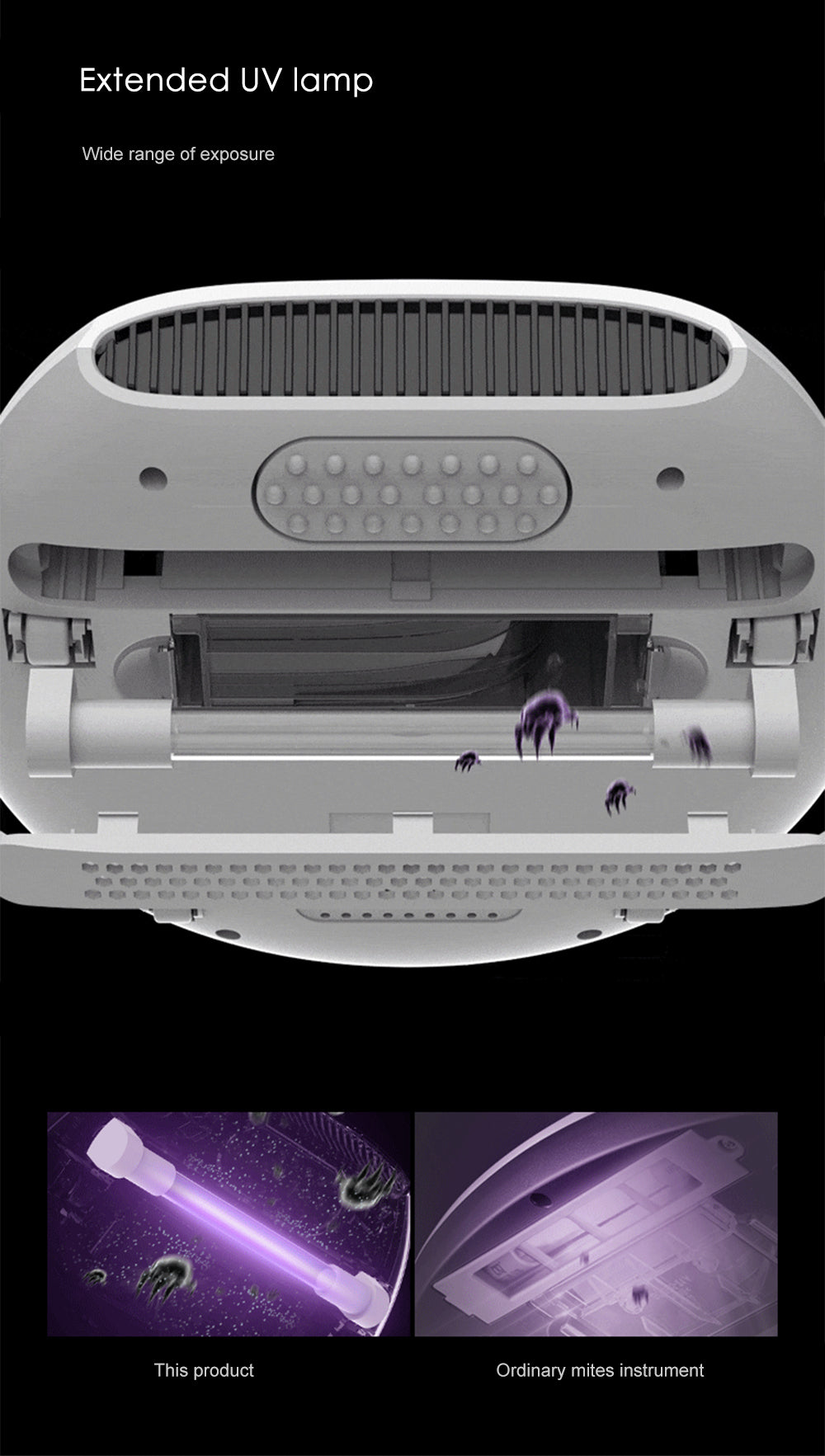 – Eliminate dust mites up to 4 layers including UV light, high temperature, vibration and suction