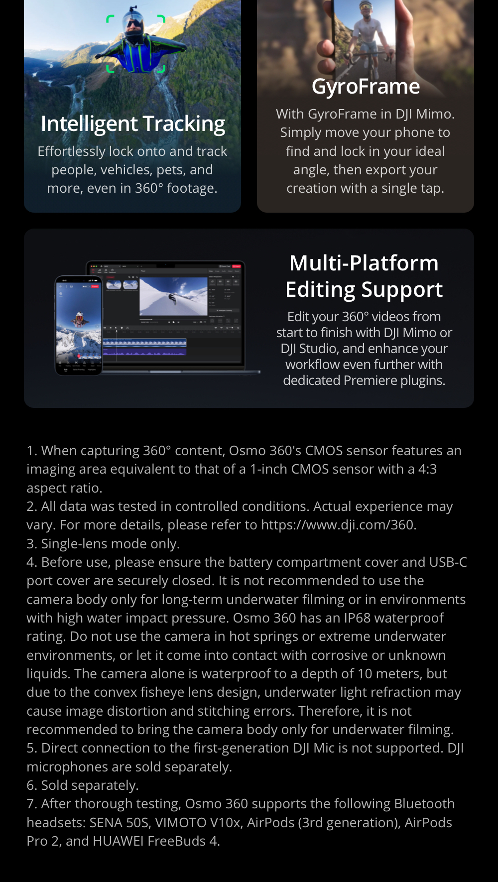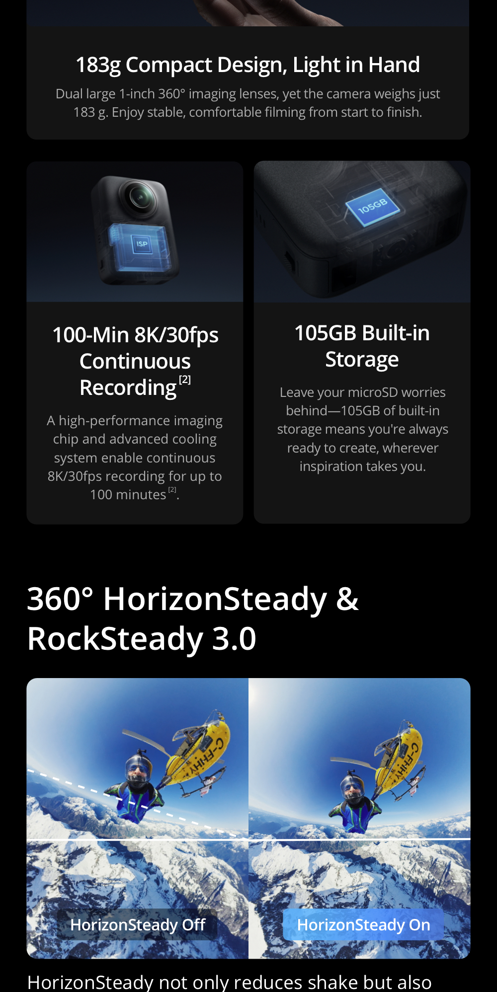 - Stereo Recording, True-to-Life Sound - Four microphones on the 360 camera, capturing audio from all directions, with switchable Mono and Stereo modes and outstanding wind noise reduction.