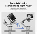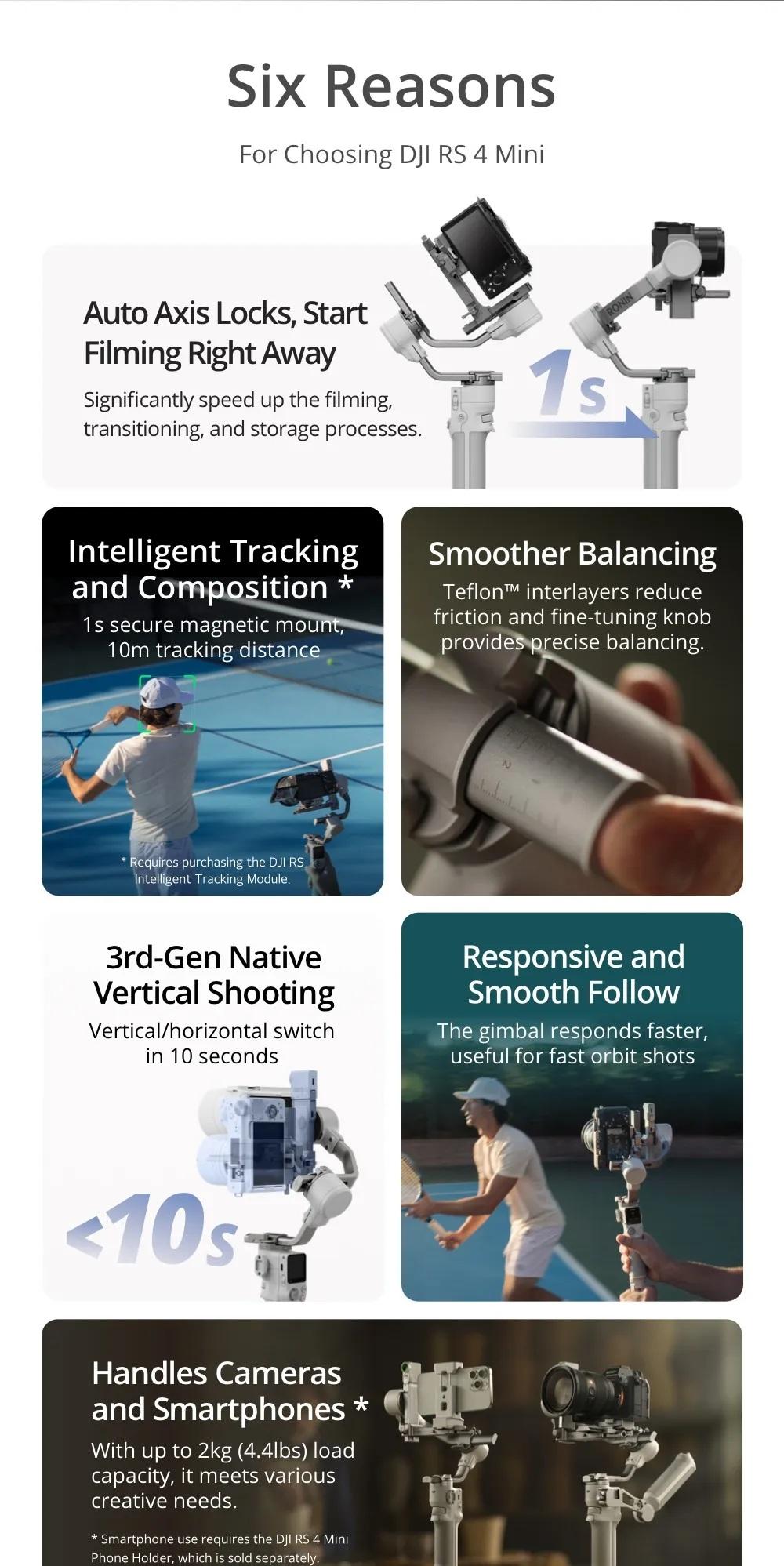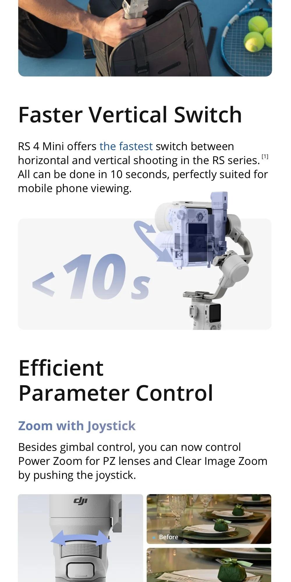 - Ready in 1 s - No more fumbling with manual locks The DJI gimbal RS 4 Mini's auto axis locks makes setup even faster. Perfect for capturing those fleeting moments or quick scene transitions.