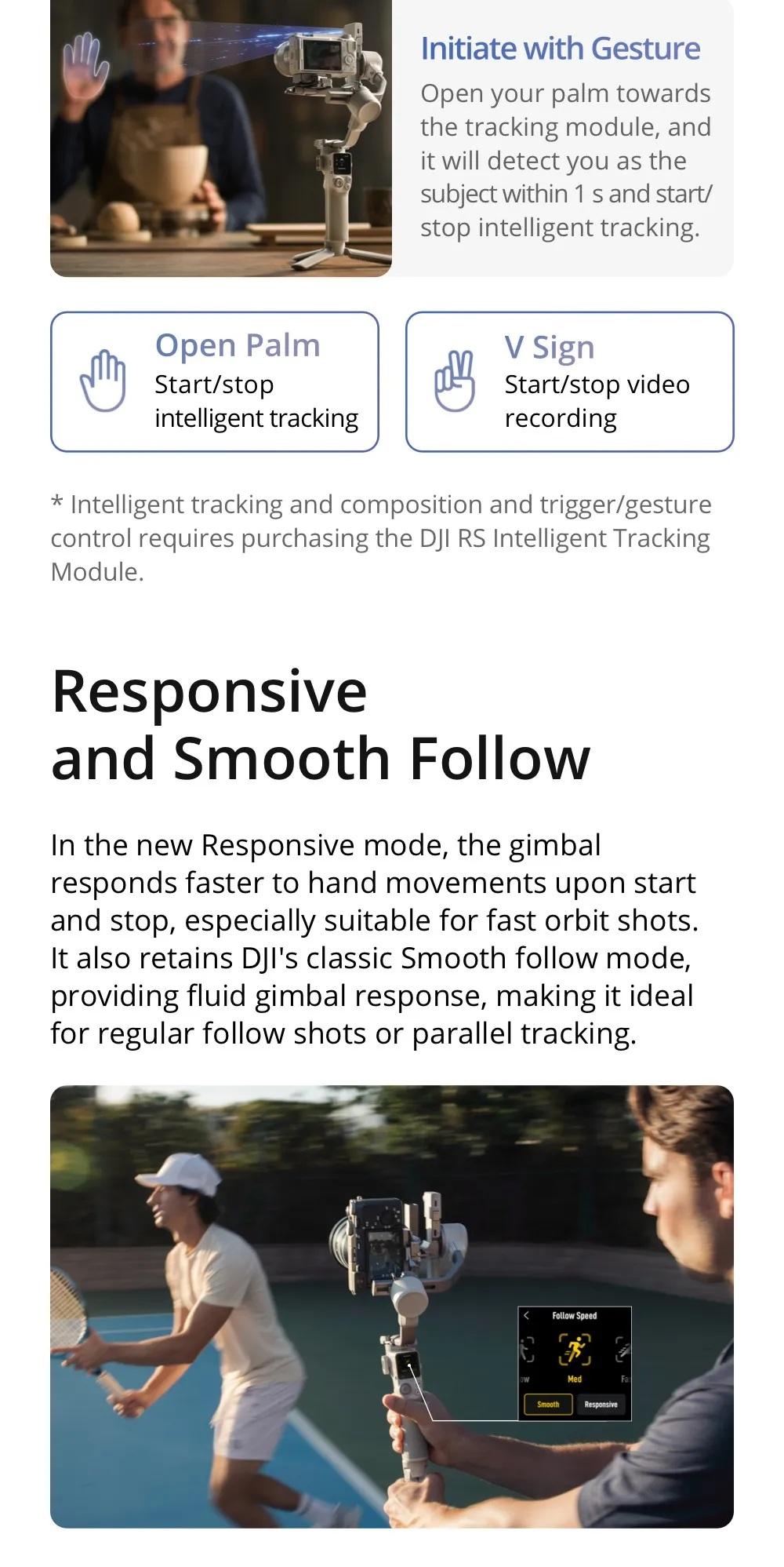 - Responsive Follow Mode - DJI RS 4 Mini's Responsive Follow Mode makes your camera gimbal react instantly to your hand movements. Ideal for fast orbit shots and dynamic scenes.