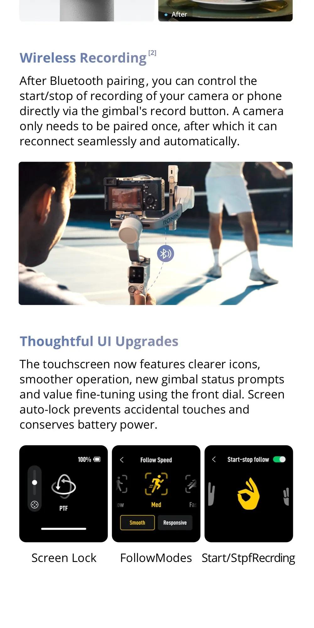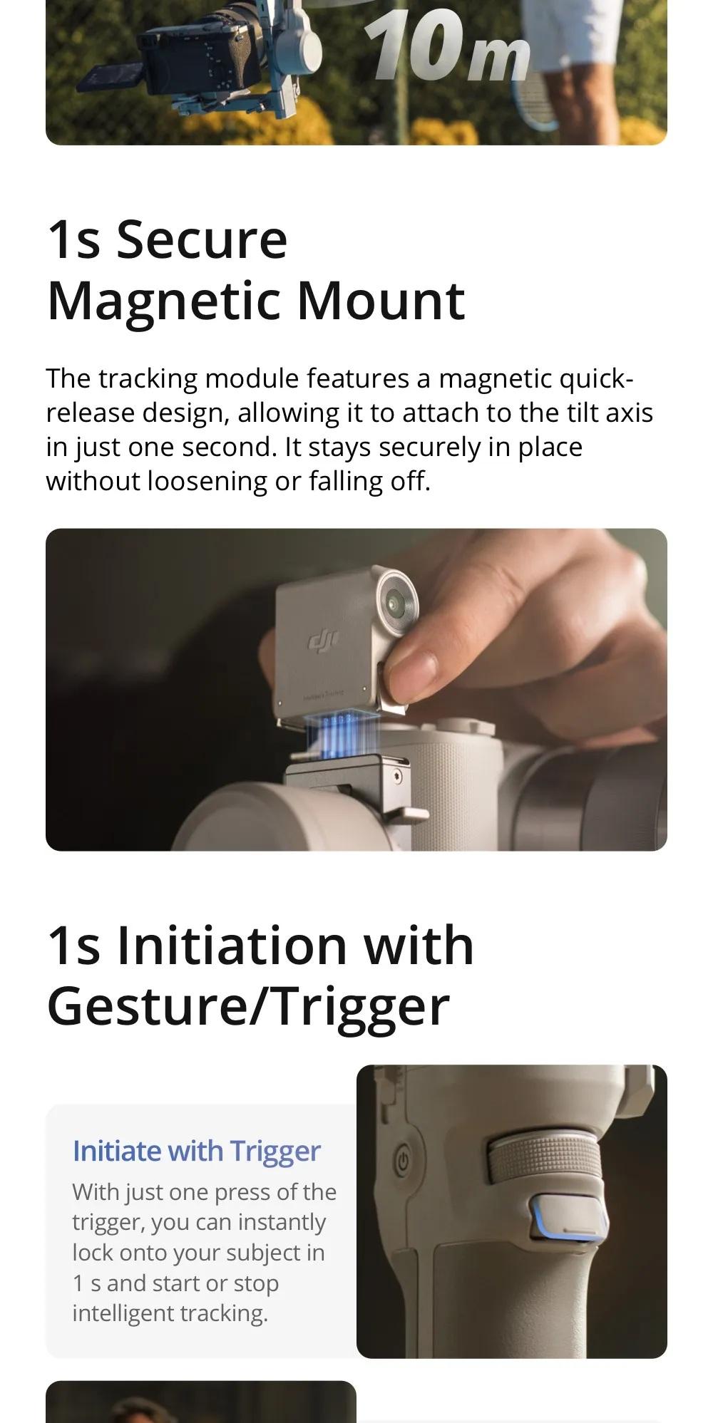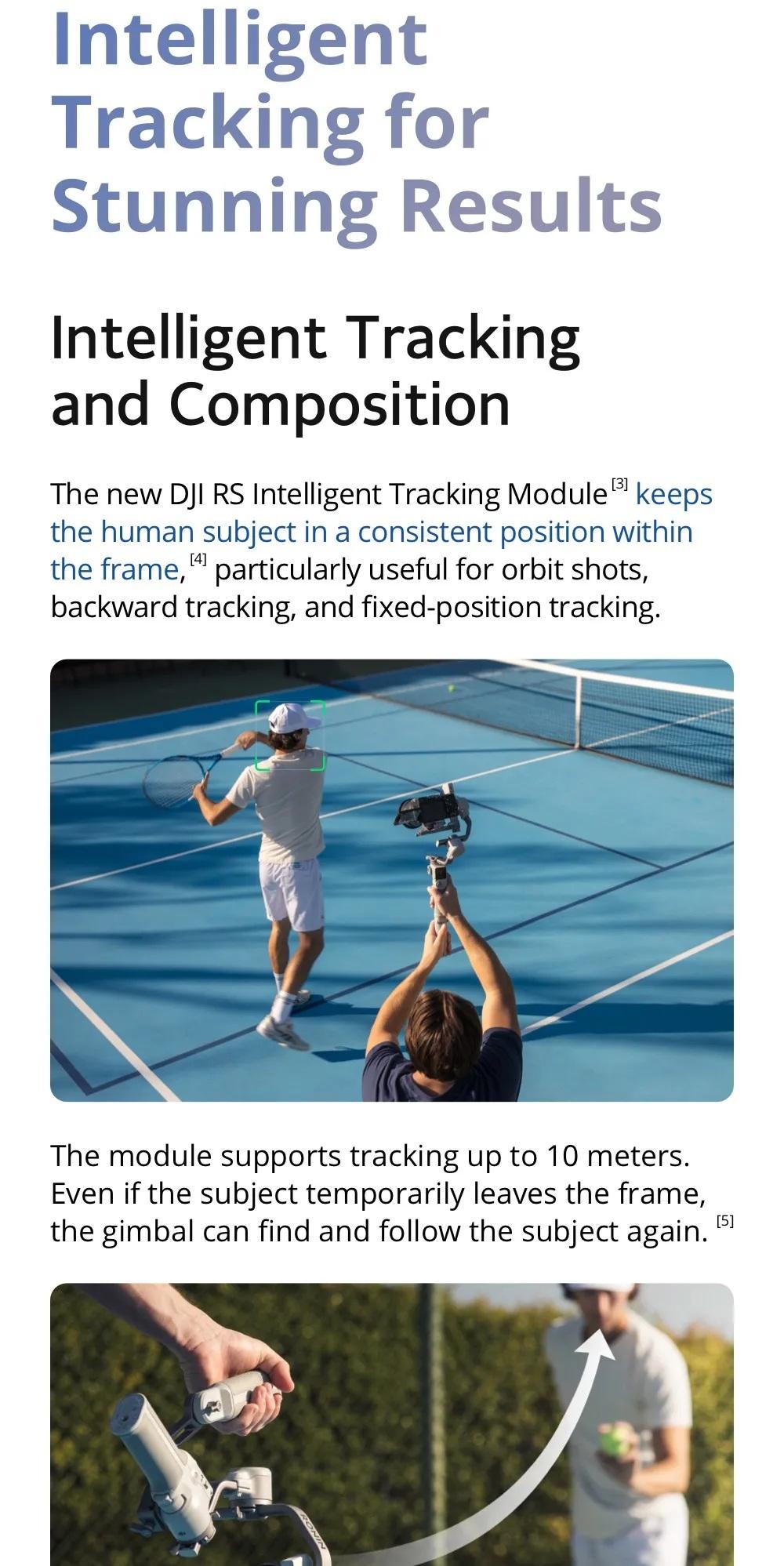 - Intelligent Tracking - RS Intelligent Tracking Module keeps your subject framed, whether you're doing orbit shots or solo filming. Ideal for dynamic scenes, this camera stabilizer ensures smooth footage.