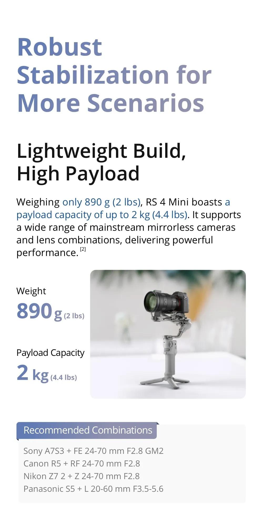 - Handles Cameras and Smartphones - The lightweight DJI RS 4 Mini supports up to 2kg/4.4lbs payload, able to handle mirrorless and vlog cams and phones, [7] adapting seamlessly to your creative scenario.