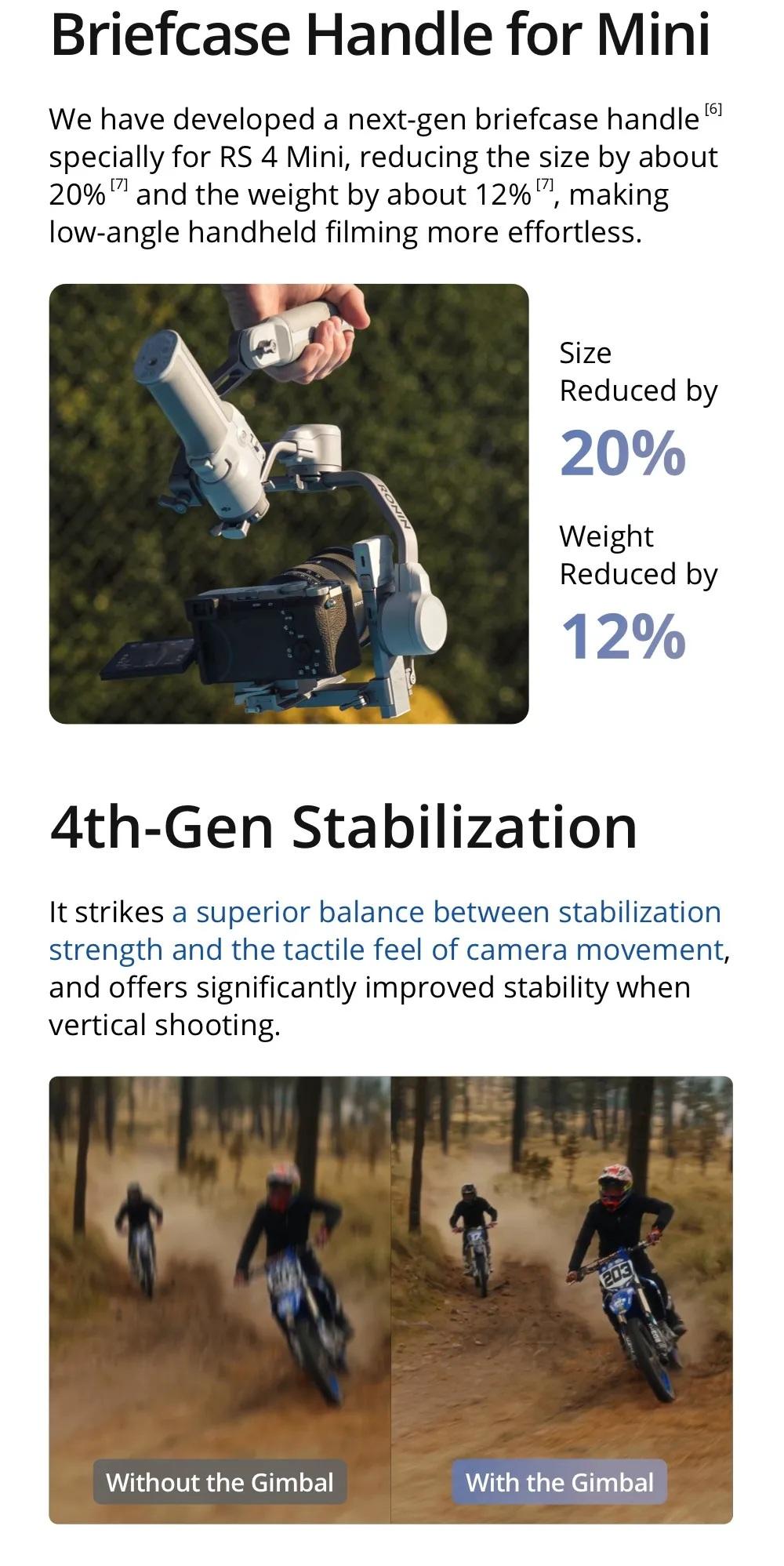 - Teflon Enhanced Balancing - DJI RS 4 Mini features smoother balancing. Ideal for quick adjustments during fast-paced shoots, ensuring your camera gimbal stabilizer is always ready to go.