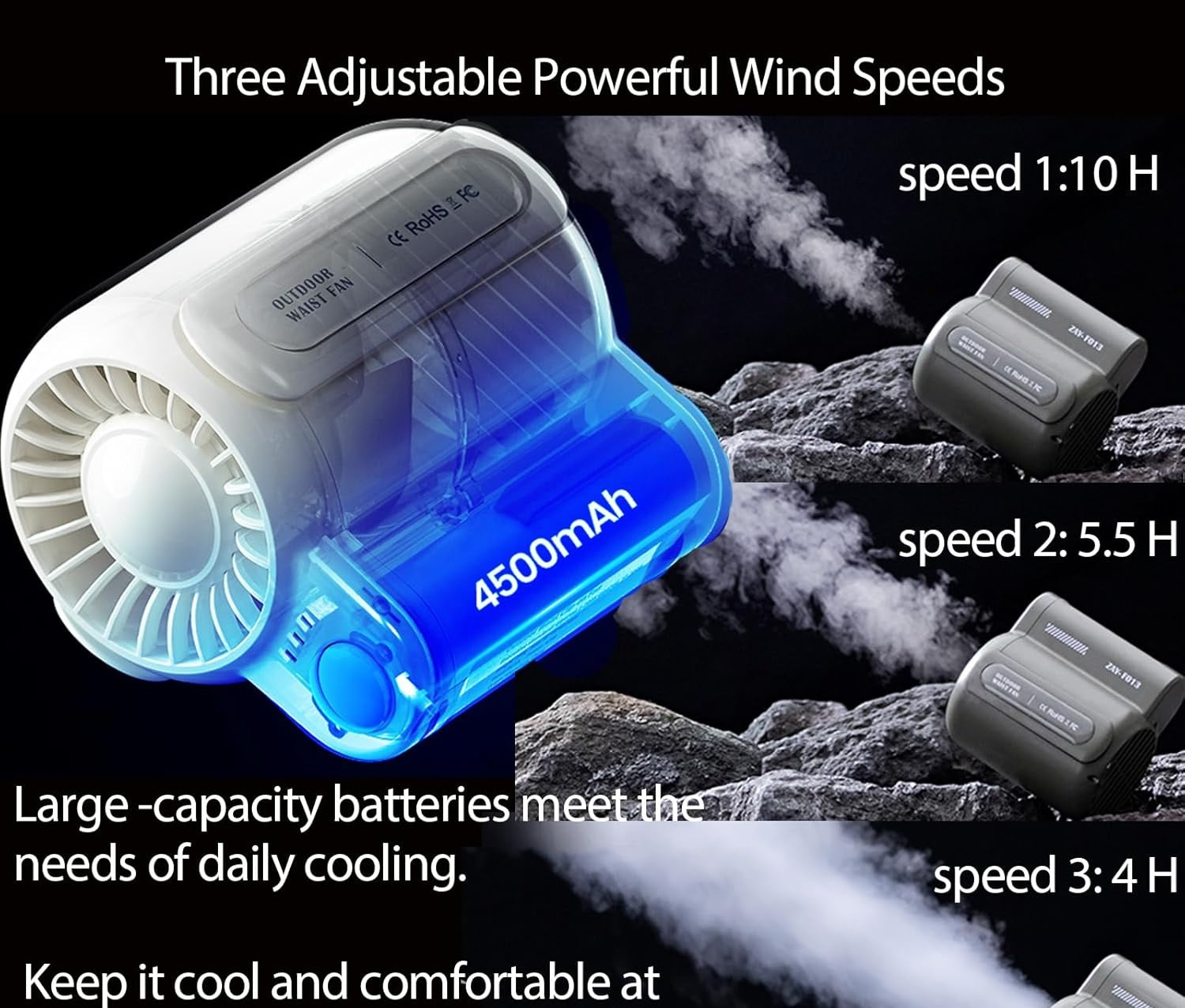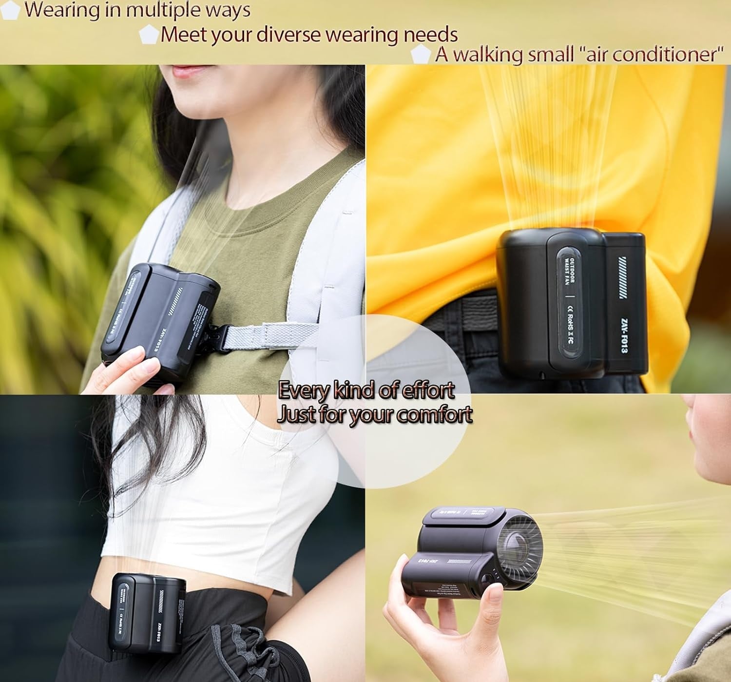 ● Belt Fan & Handheld Fan: Feel the power of upgraded speed and wind-This Wearable Fan uses powerful turbine drivers to quickly produce strong air volume, providing a strong and effective experience for heat dissipation. Its design is optimized and can be used as a waist fan and handheld fan, with multiple ways to wear. Make the wind immediately reach the sweating part of the body, relieve your fatigue and make you feel comfortable
