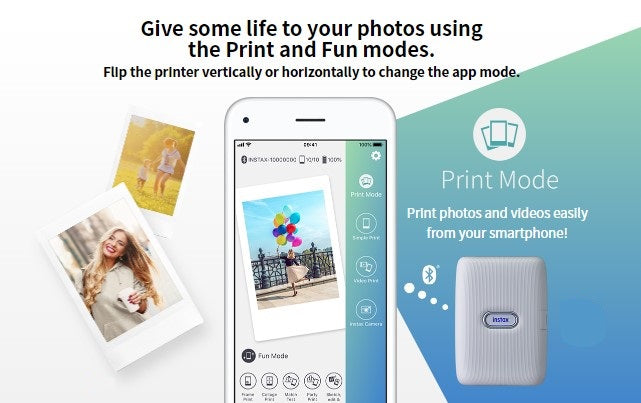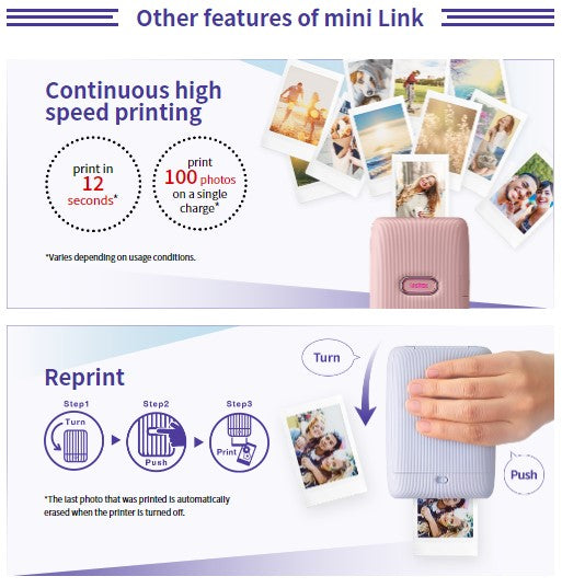 The photo prints in just 12 seconds after the image is sent from your smartphone. Approximatley 100 photos can be printed continuously (when fully charged).