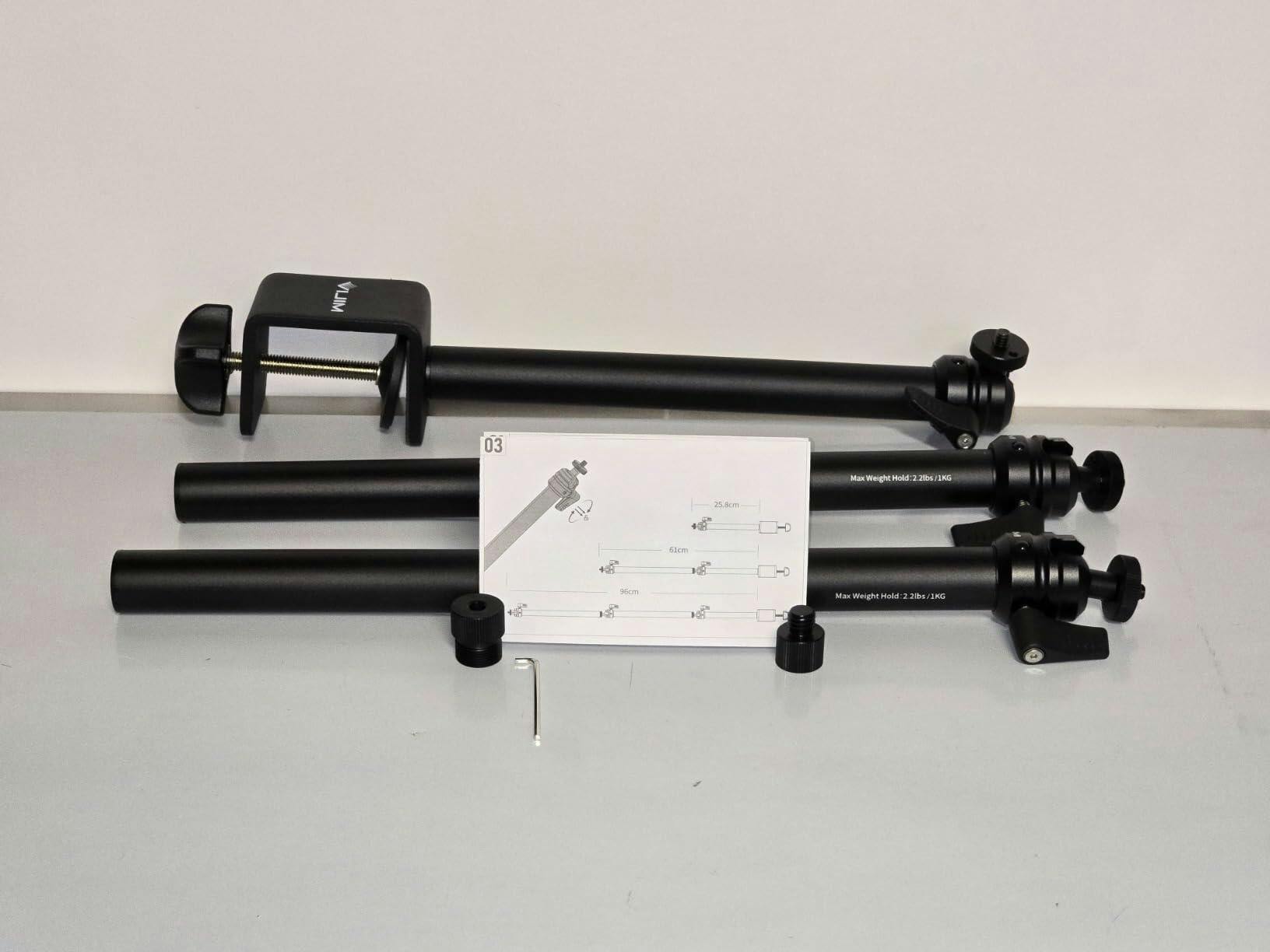 ● Package contents Standard with table clamp and tripod head, 2x extension arm with tripod head, 1/4″ to 3/8″ screw, 1/4″ to 5/8″ screw, Allen key, manual