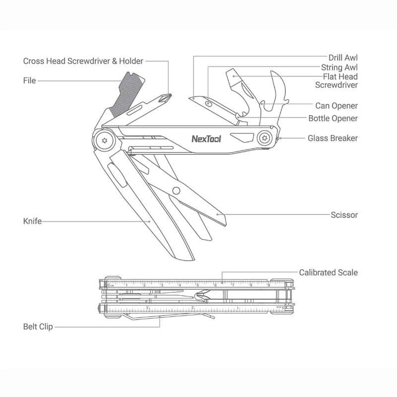 Nextool KT520077 Knight Multitool Portable 12in1 Knife Tool Kit Scissors Phillips Flathead Screwdriver Drill String Awl Can and Bottle Opener File Glass Breaker Scale Belt Clip