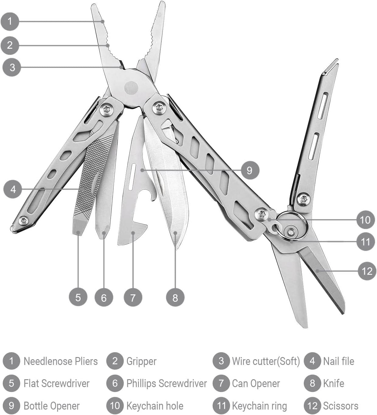 - 10 in 1 MULTITOOL: A great pocket size pliers scissors combined with Pliers, Scissors, Knife, Bottle/Can Opener, Nail File, Screwdriver and Keychain. Tool kit and survival kit in one, this powerhouse pocket cuts, crimps and tightens twice as easy.