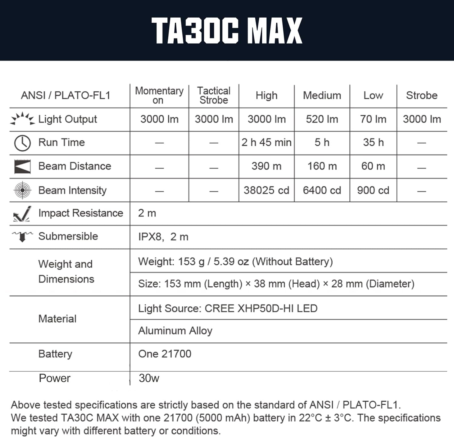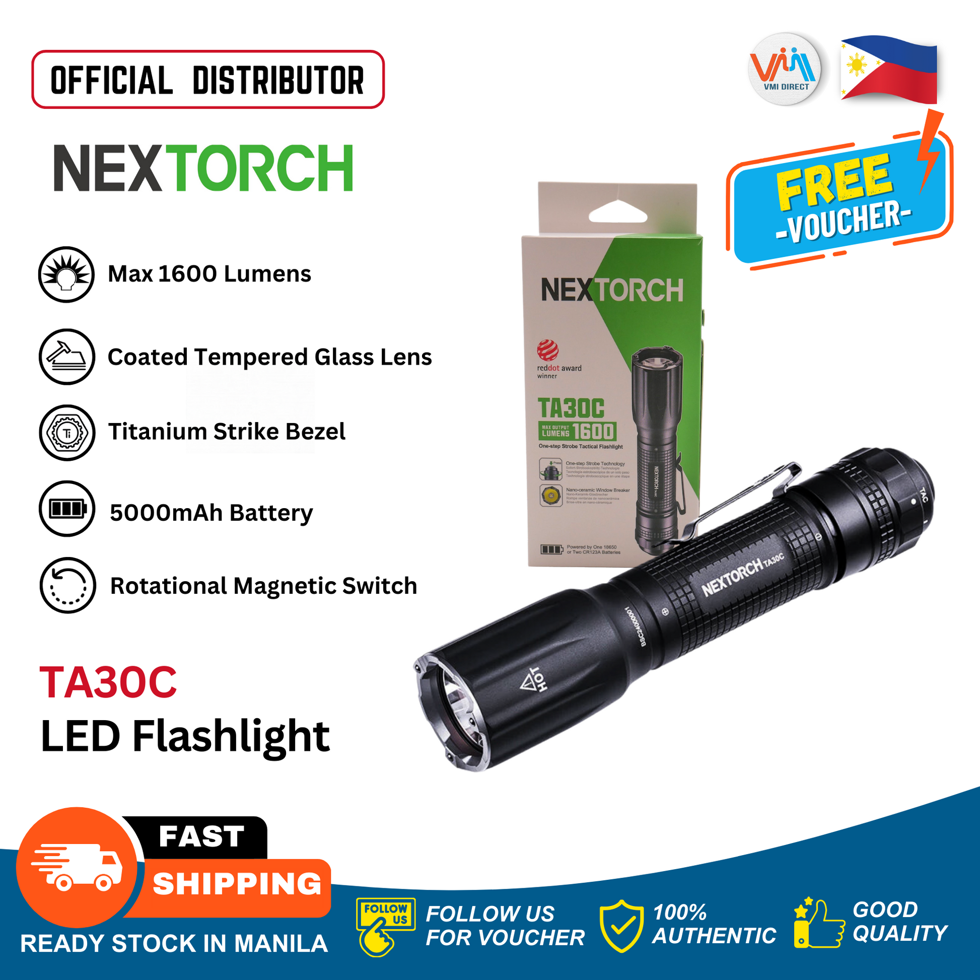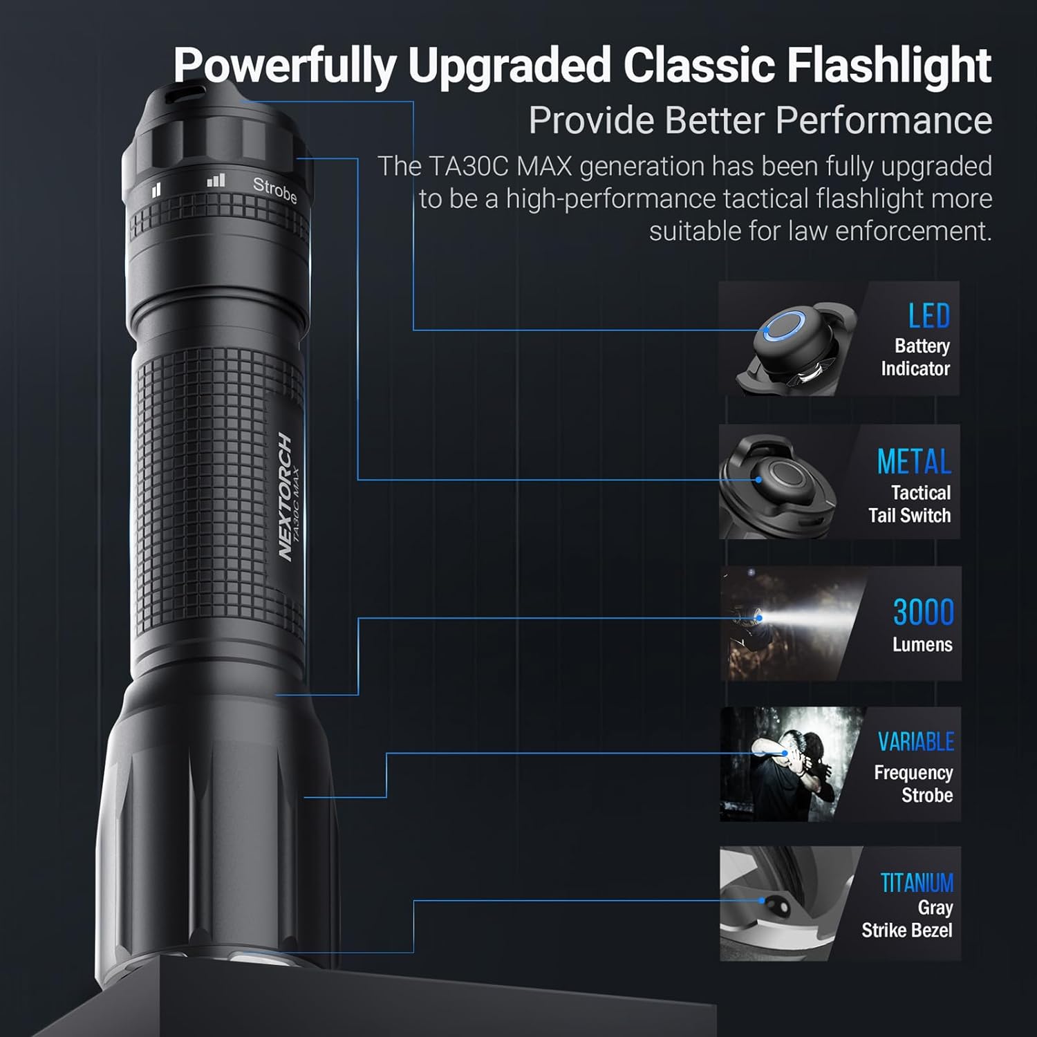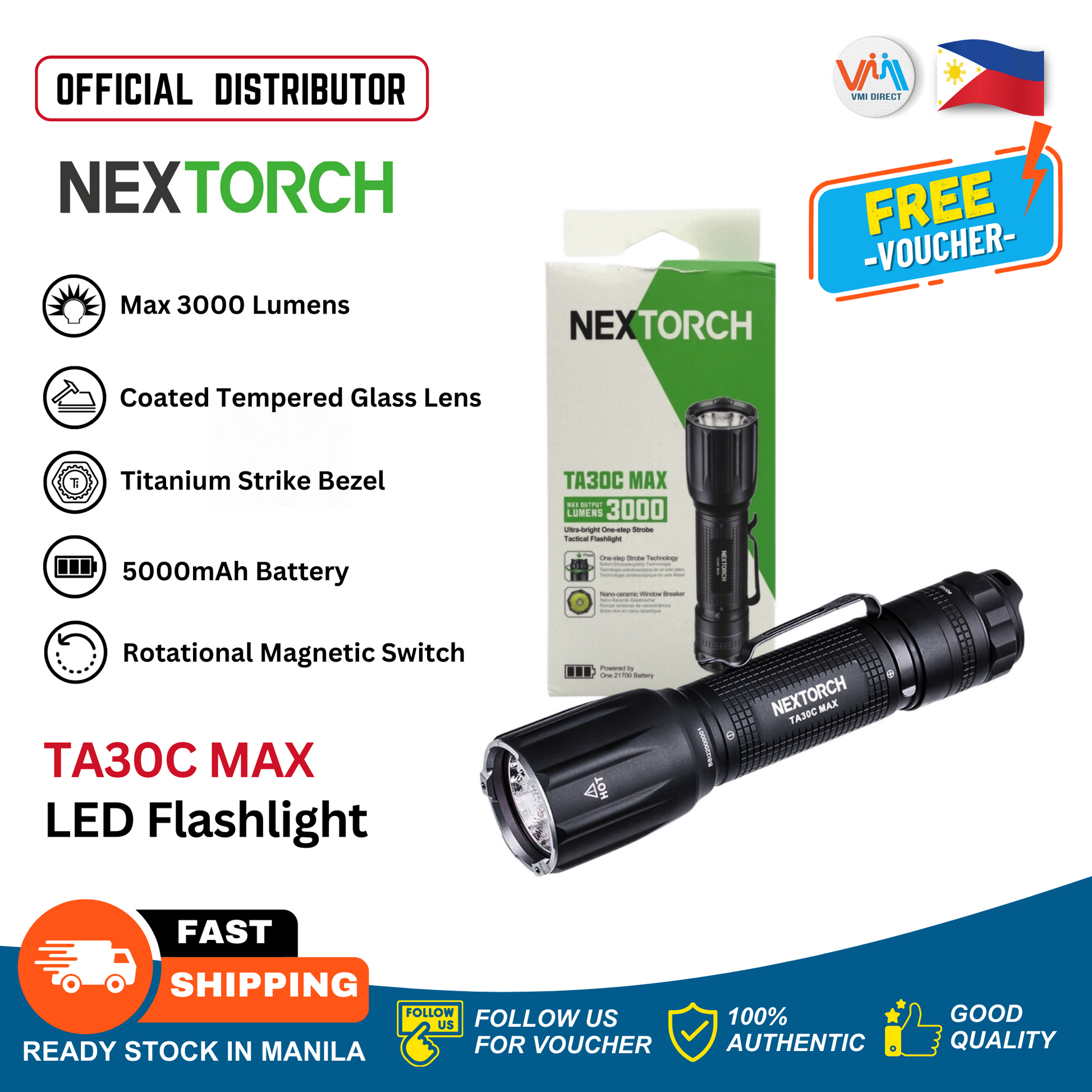 - PROFESSIONAL CARRYING TACTICAL FLASHLIGHT NEXTORCH TA30C MAX tactical flashlight high performance produces up to 3000 lumens of output with a beam distance of up to 390 meters. 6.02 inches (L) 1.50 inches (head diameter) 1.10 inches (barrel diameter) compact LED tactical flashlight weighs 5.39 oz (without batteries), achieve a balance between performance and size, hardcore and compact, suitable for both tactical and commuting purposes.
