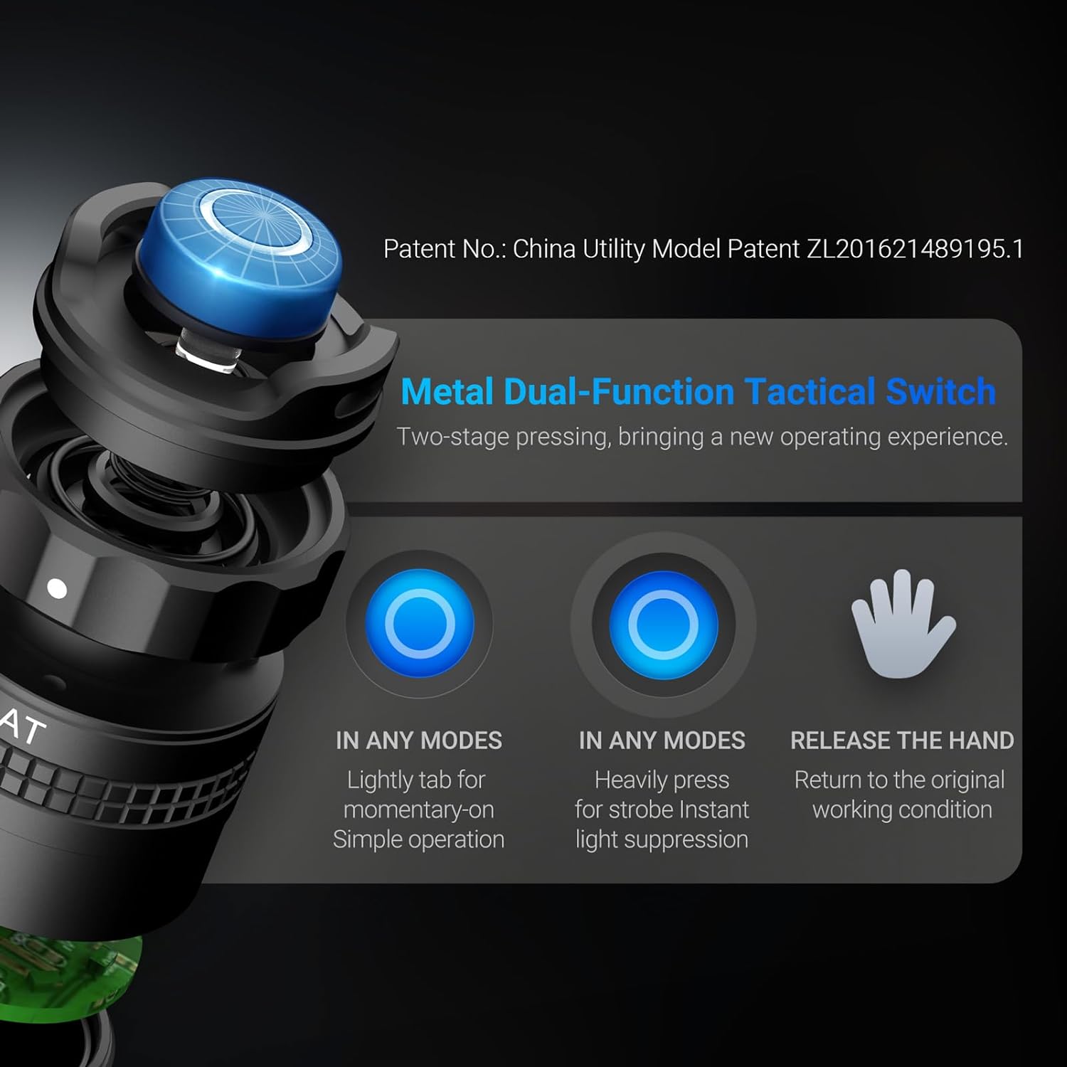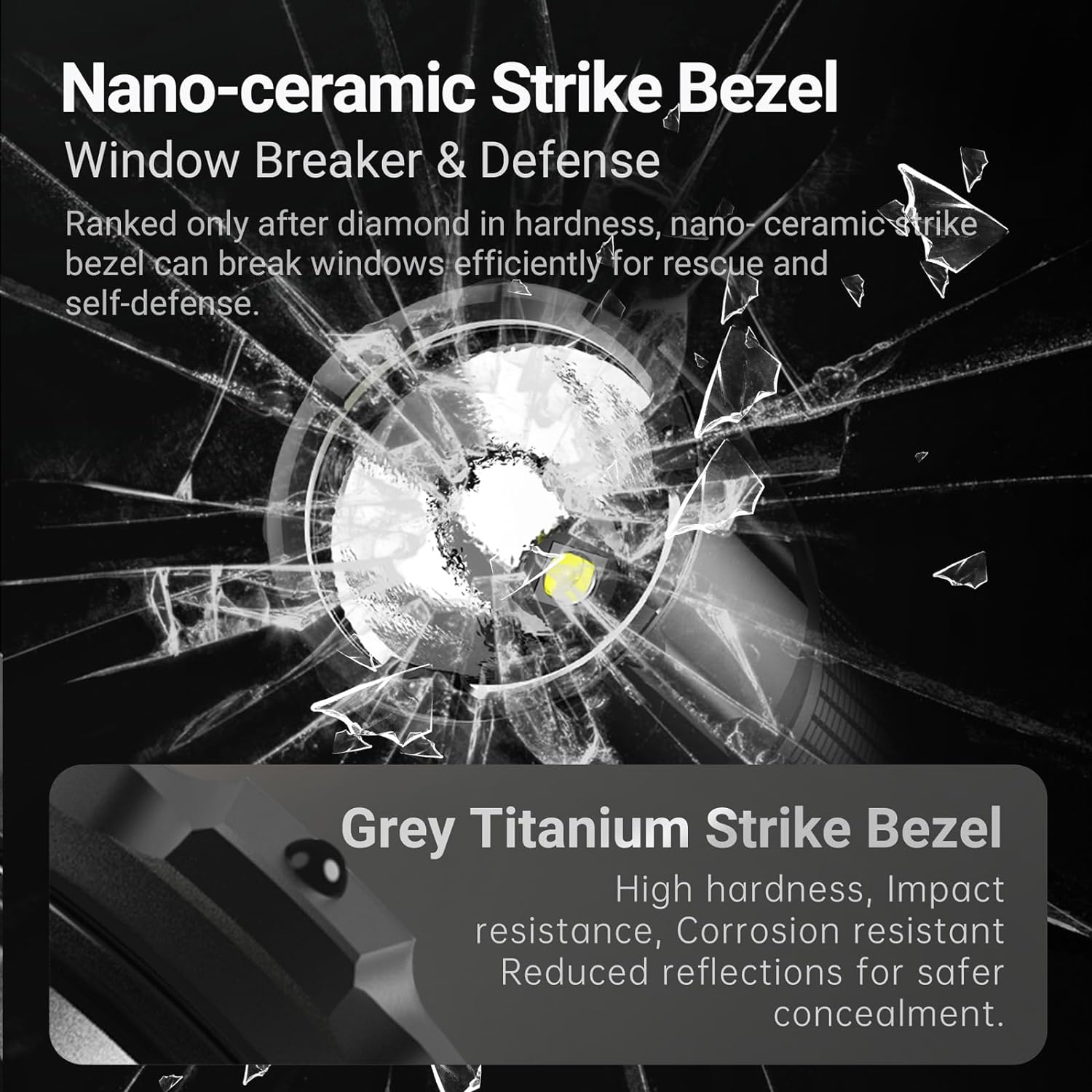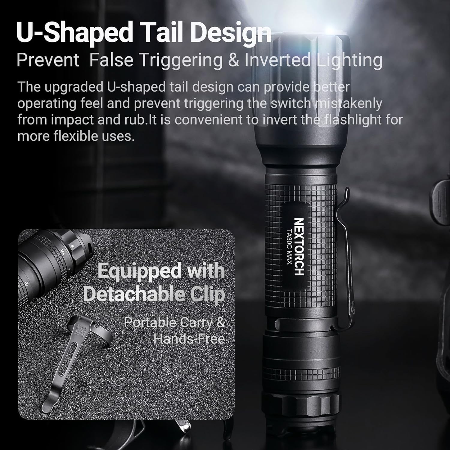 - MULTI-FUNCTIONAL UNIQUE DESIGN NEXTORCH tactical flashlight patented design, TA series unique mute button for tactical, rotary magnetron, switch tactical, high brightness, medium brightness, low brightness, strobe mode, match different use needs. Five light modes 3000 lm (390m), 520 lm (160m), 70 lm (60m), momentary on, strobe, and ultra-high hardness ceramic bead attack head, hardness is second only to diamond, can quickly break the car window glass, to meet the unarmed defense, window rescue, tactical break-in and other emergency needs.