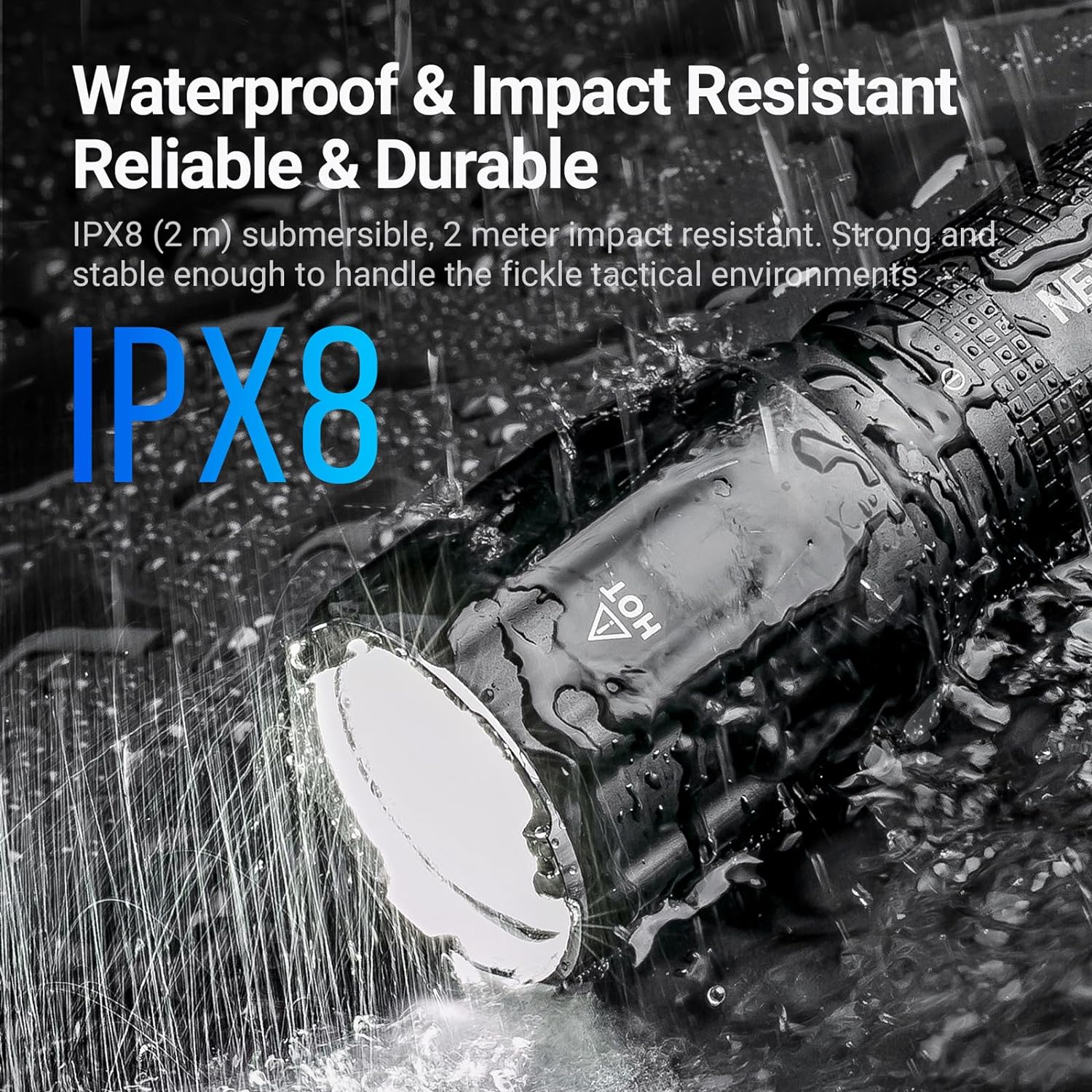 - WATERPROOF & INDESTRUCTIBLE QUALITY NEXTORCH high quality tactical flashlight is waterproof and drop-proof, reliable and durable. 2 meters drop-proof, IPX8 (2 meters) waterproof, more comprehensive for more peace of mind! The surface treatment hard anodized aircraft grade aluminum alloy material makes this flashlight sturdy and stable enough to handle changing tactical environments as a law enforcement flashlight.