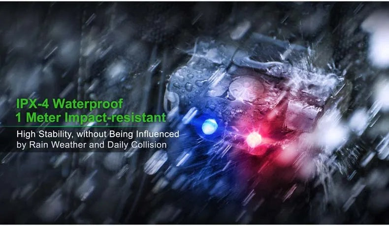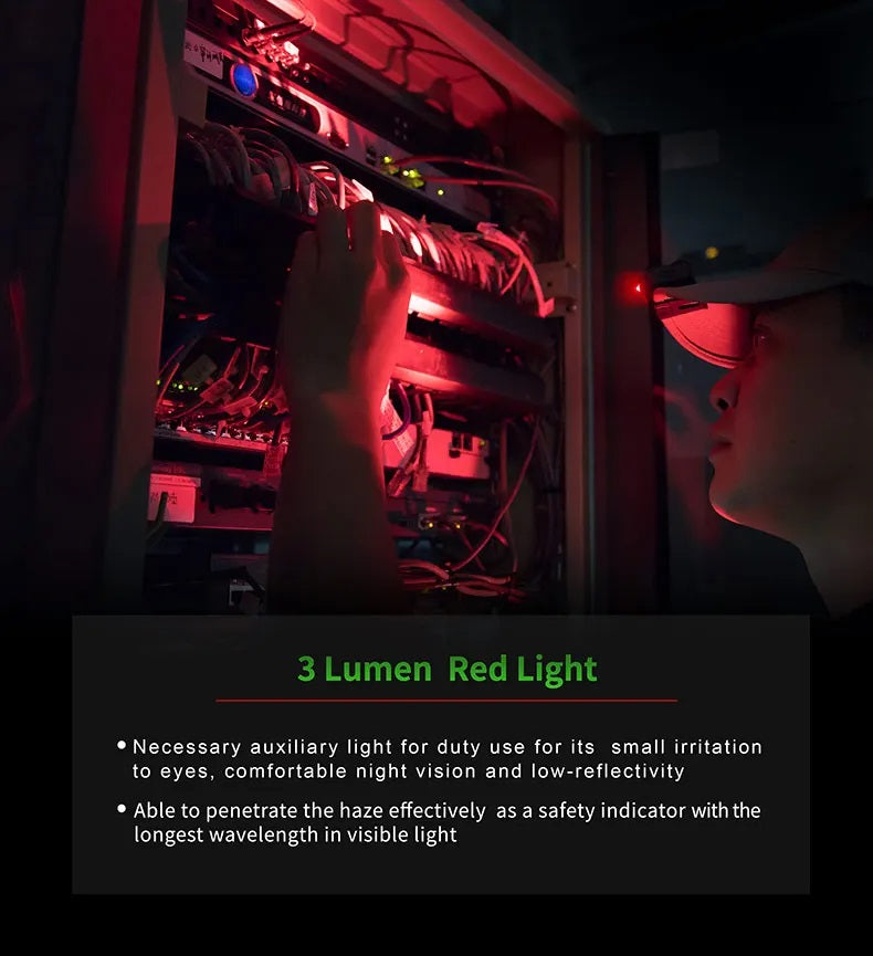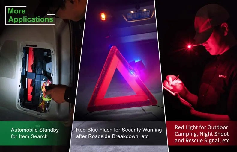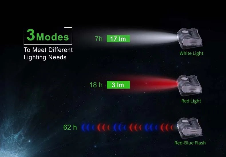 3 modes for various needs: constant-on white, constant-on red, flashing (Red Blue)