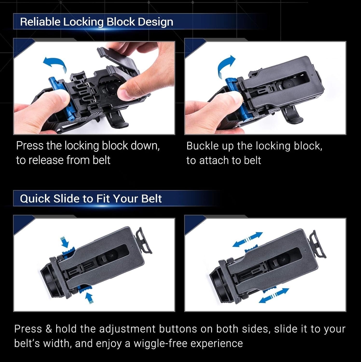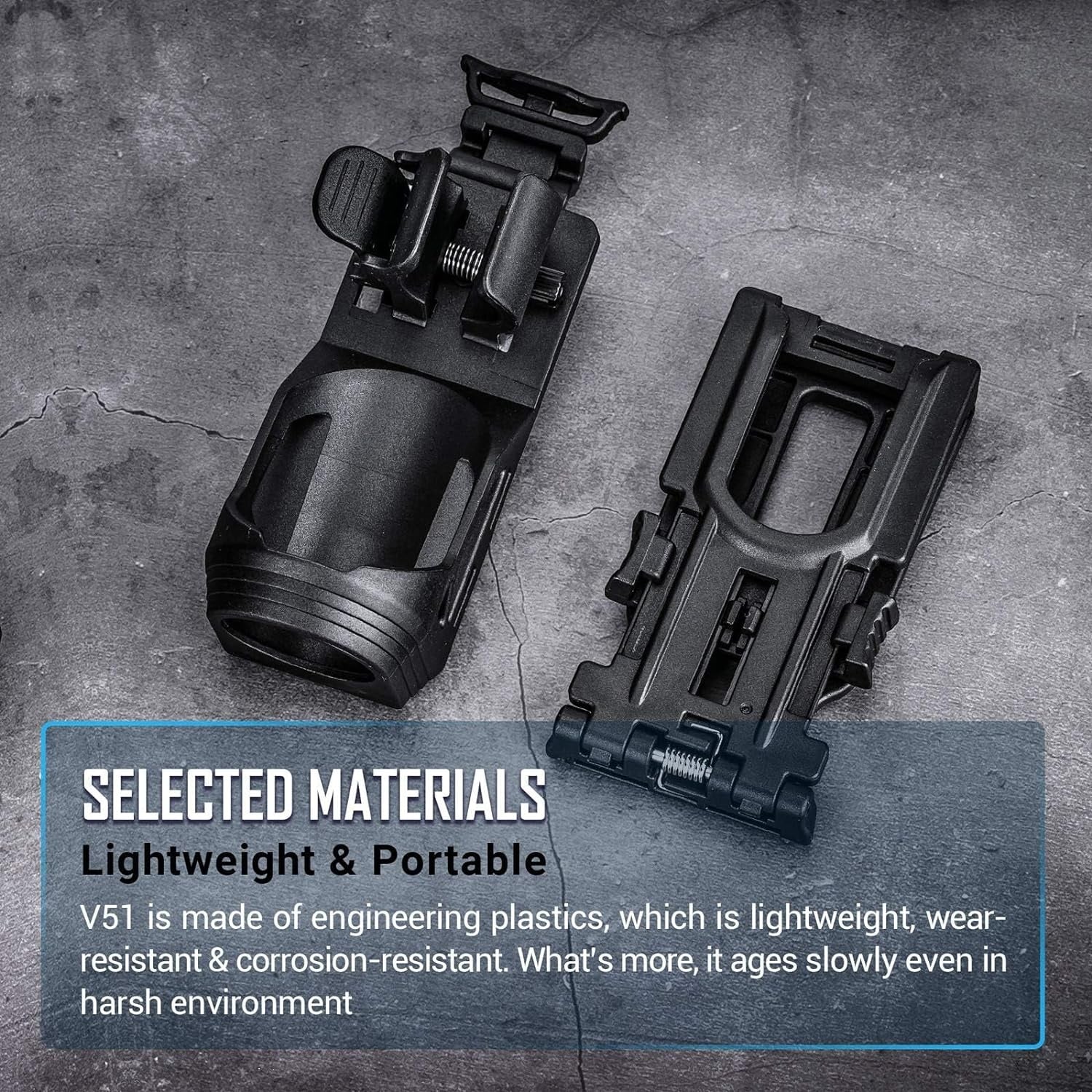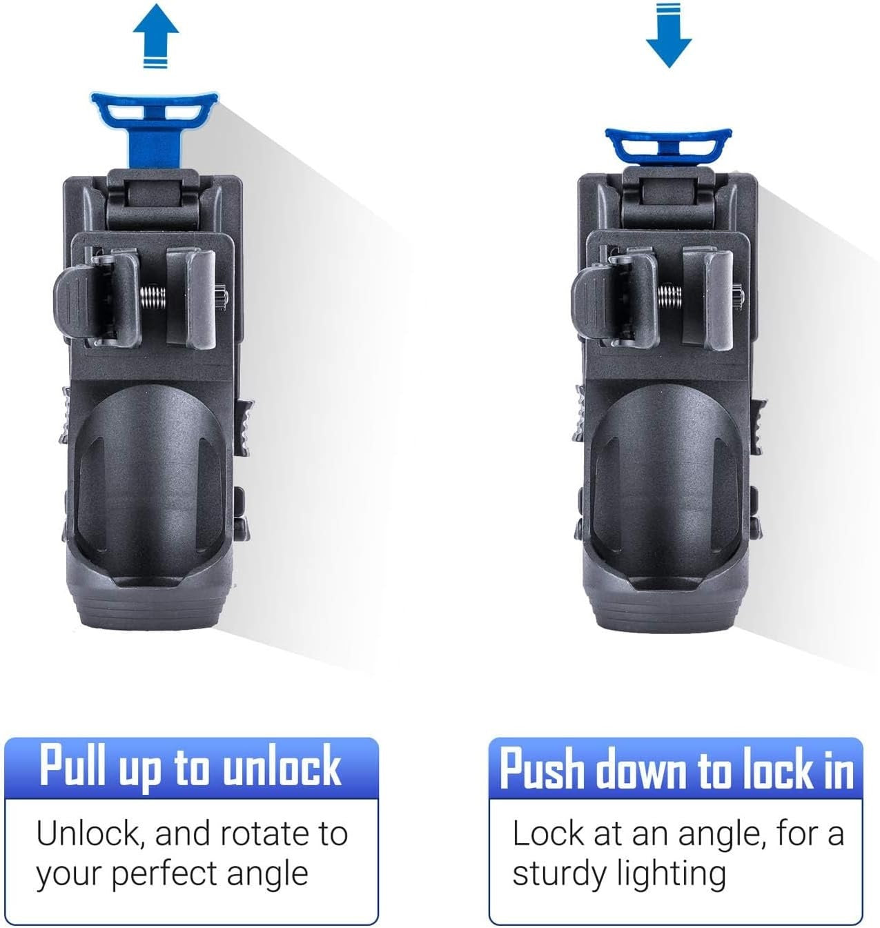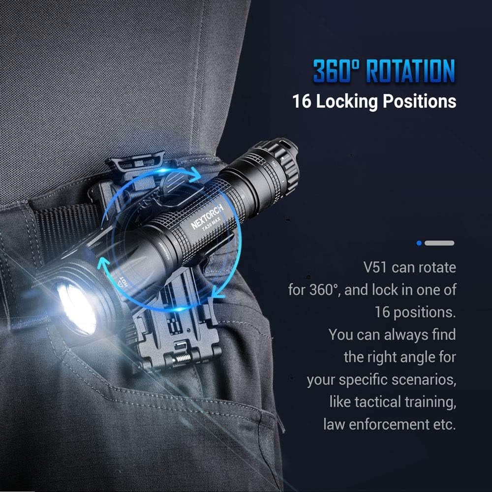 - 【360 degree rotation, 16 locking positions】V51 can rotate for 360 degrees and lock in one of 16 positions for 1-1.25'' flashlight, can find the right angle for your need. Remember to adjust the holder width via twisting the pin before putting your flashlight in the holster.